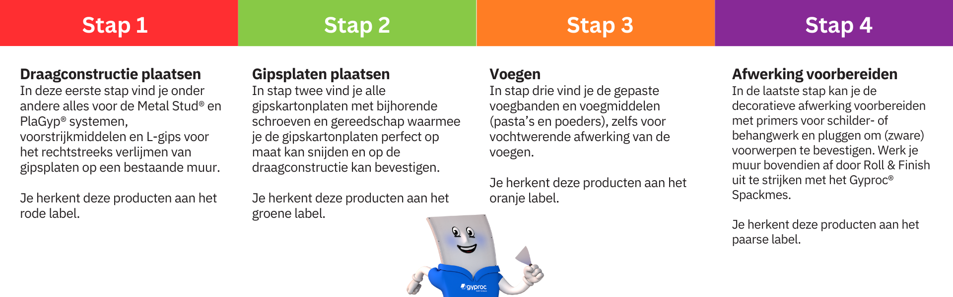 Op de volgende pagina's tonen we je hoe je zelf aan de slag kan gaan bij het plaatsen van onder meer scheidingswanden, voorzetwanden en plafonds. Met een heldere uitleg, foto’s en video’s tonen we je stap voor stap hoe je best te werk gaat.